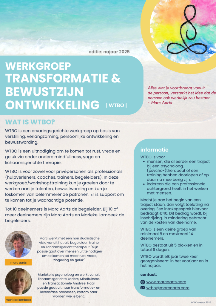 Marc Aarts verzorgt ook groepen en opleidingen in zijn praktijk. Deze opleiding heet WTBO: Werkgroep Transformatie en Bewustzijn Ontwikkeling.